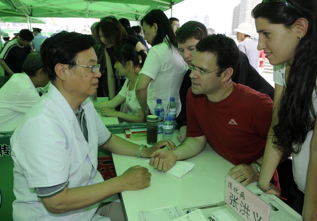 5月23日,在天津啟動(dòng)儀式上,天津中醫(yī)藥大學(xué)的專(zhuān)家位外國(guó)友人把脈看病