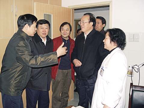 吳剛(左二)在湖南中醫(yī)藥大學(xué)第二附屬醫(yī)院調(diào)研 國家中醫(yī)藥管理局副局長吳剛?cè)涨霸诤峡疾靽抑嗅t(yī)臨床研究基地建設(shè)情況時指出,該項目是迄今為止中央投入最大的中醫(yī)專項,在中醫(yī)藥行業(yè)具有里程碑式的意義。醫(yī)" />