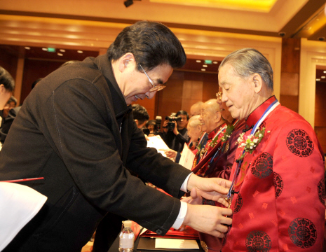 郭金龍、王國強、丁向陽等領導向獲得首都國醫(yī)名師的專家教授頒發(fā)獎章和證書。圖為郭金龍(左)為首都國醫(yī)名師路志正教授頒發(fā)獎章。 巨 鋒/攝 郭金龍、王國強、丁向陽等領導向10位第三批全國及北京市老中醫(yī)藥專家學術經驗繼承指導老師代表頒獎。圖為王國強(左)向獲獎指導老師代表張炳厚教授頒發(fā)獎金。 巨 鋒/攝