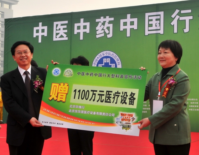 中國科協(xié)書記處書記程東紅(右)代表組委會向湖北省贈送醫(yī)療設備_省衛(wèi)生廳副廳長姚運接受捐贈(巨鋒攝)