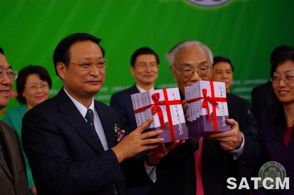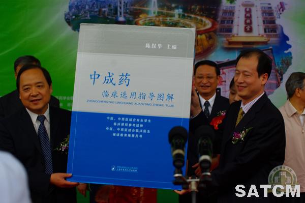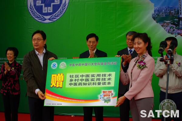 國(guó)家中醫(yī)藥管理局辦公室副主任兼新聞辦主任蔣健代表全國(guó)組委會(huì)向上海贈(zèng)送中醫(yī)藥科普?qǐng)D書(shū)