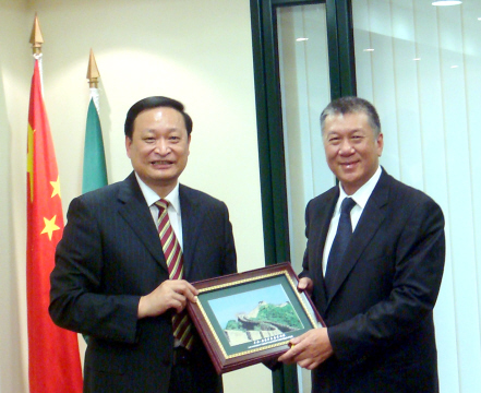 王國強(qiáng)副部長(zhǎng)(左)向何厚鏵行政長(zhǎng)官贈(zèng)送紀(jì)念品。 李亞嬋/攝