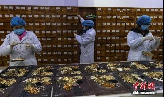 中醫(yī)醫(yī)院藥劑師在藥房配藥。