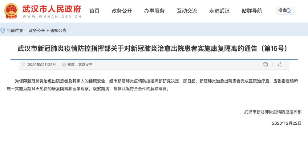 為保障新冠肺炎治愈出院患者及其家人的健康安全,經(jīng)市新冠肺炎疫情防控指揮部研究決定,即日起,新冠肺炎治愈出院患者完成醫(yī)院治療后,應到指定場所統(tǒng)一實施為期14天免費的康復隔離和醫(yī)學觀察。觀察期滿,身體狀況符合條件的解除隔離。
