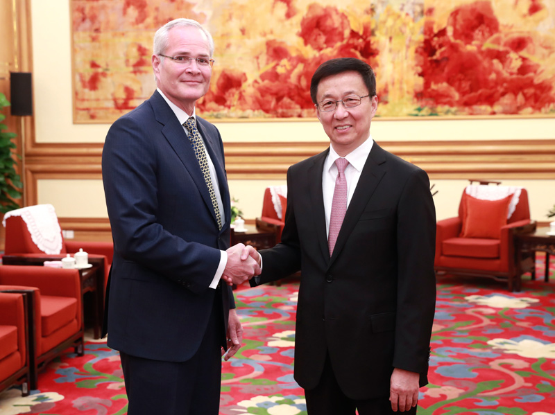 4月4日,中共中央政治局常委、國務(wù)院副總理韓正在北京中南海會(huì)見美國??松梨诠径麻L兼首席執(zhí)行官伍德倫。新華社記者 龐興雷 攝
