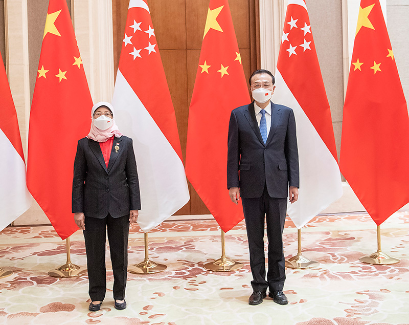 李克強(qiáng)表示,新加坡是中國在東盟的重要合作伙伴。面對(duì)疫情沖擊和世界經(jīng)濟(jì)復(fù)蘇分化,兩國關(guān)系保持健康穩(wěn)定發(fā)展,合作逆勢而上,為增進(jìn)兩國人民福祉、維護(hù)國際和地區(qū)和平穩(wěn)定發(fā)揮了積極作用。習(xí)近平主席明天將同總統(tǒng)女士會(huì)晤。中方高度重視發(fā)展同新加坡的關(guān)系,愿同新方保持高層交往,深化發(fā)展戰(zhàn)略對(duì)接,推動(dòng)“國際陸海貿(mào)易新通道”在交通物流、機(jī)制建設(shè)、國際合作等領(lǐng)域取得新的成果,加強(qiáng)在金融、抗疫、職業(yè)教育培訓(xùn)等多領(lǐng)域合作,更好造福兩國和兩國人民。