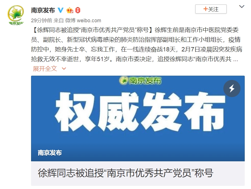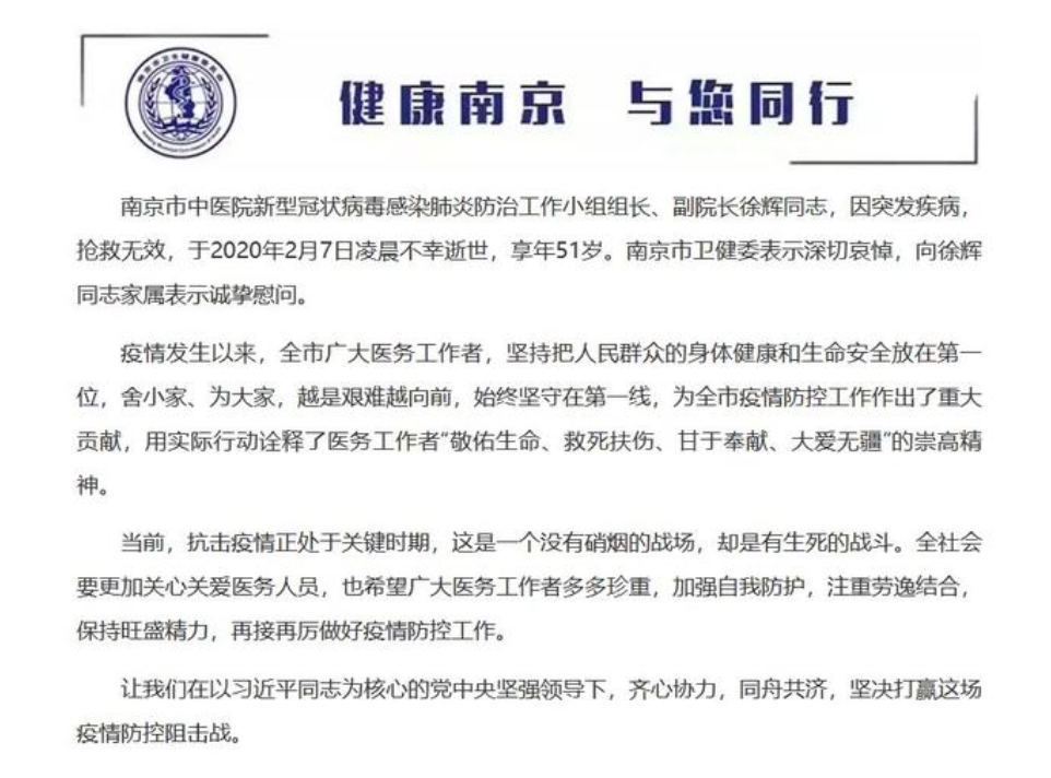 徐輝生前是南京市中醫(yī)院黨委委員、副院長、新型冠狀病毒感染的肺炎防治指揮部副組長和工作小組組長。疫情防控中,她身先士卒、忘我工作,在一線連續(xù)奮戰(zhàn)18天,2月7日凌晨因突發(fā)疾病搶救無效不幸逝世,享年51歲。2020年2月11日,南京市委決定,追授徐輝同志“南京市優(yōu)秀共產(chǎn)黨員”稱號。